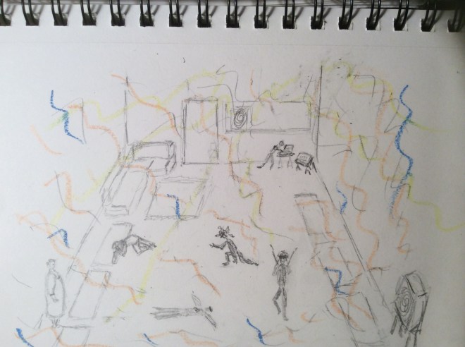 In this sketch I tried to represent some hint of the presence of music as a physical force, sound waves that filled the room and wrapped our moving bodies like swaddling clothes. Out of this chaos, something was surely being born.