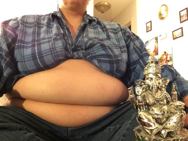 Yes, Ganesh’s belly is amazing. Ganesh is amazing! He is definitely a sensual fat guy. He loves the pleasures of the Earth, but his lack of attachment makes him light enough to dance on one toe on the back of a mouse.